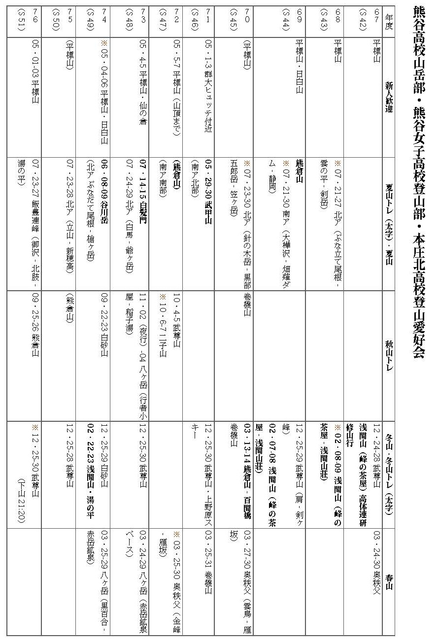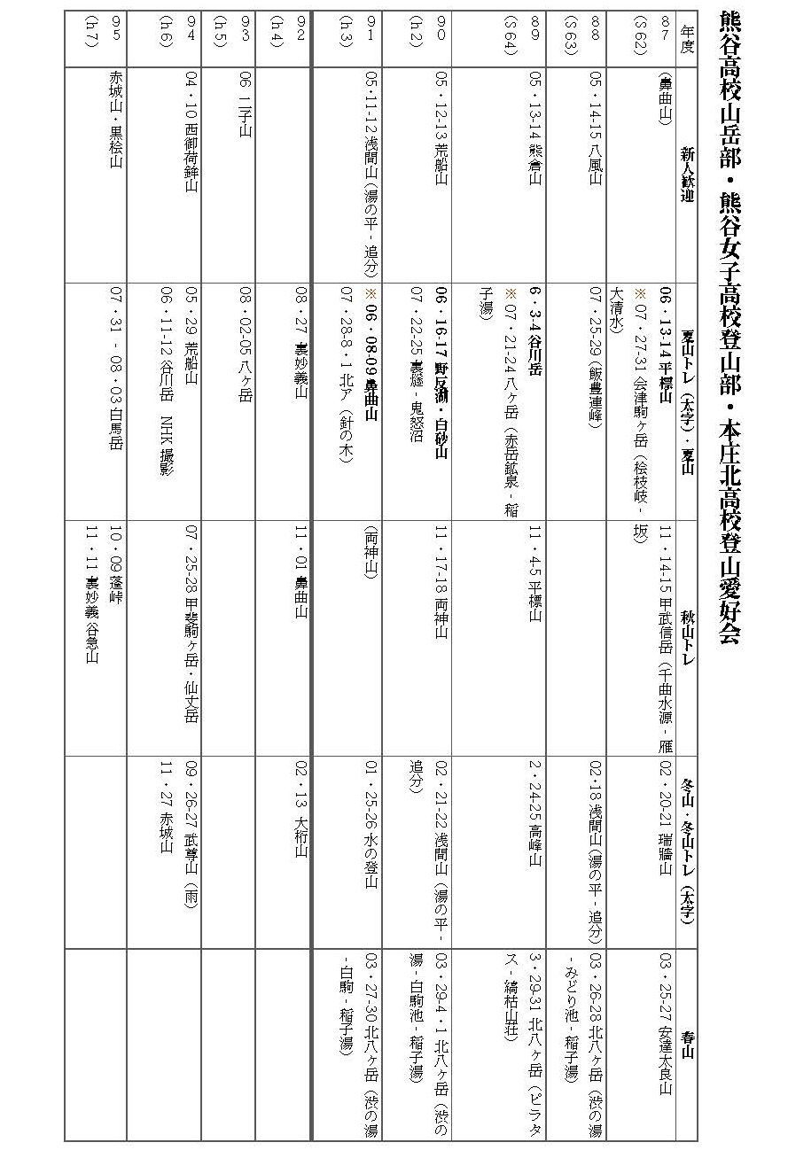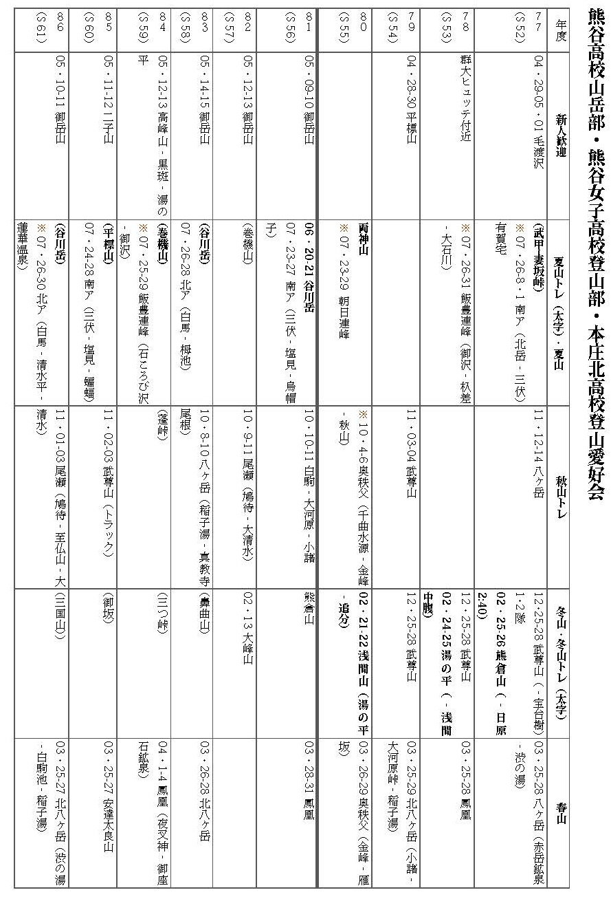 (1)縦の項「新人歓迎合宿」から「春山合宿」までは、熊谷高校山岳部の活動区分を表します。熊谷女子高校登山部、