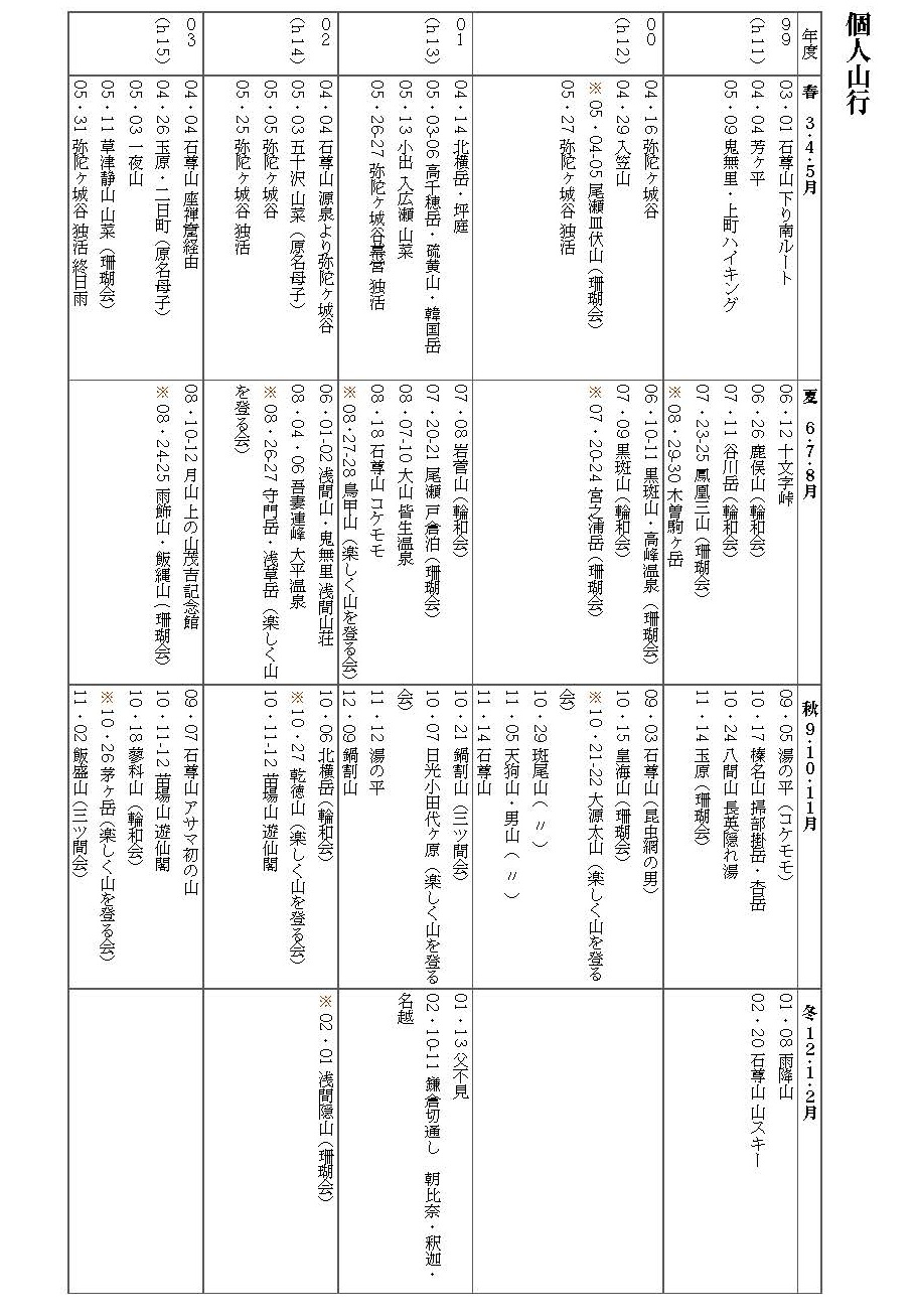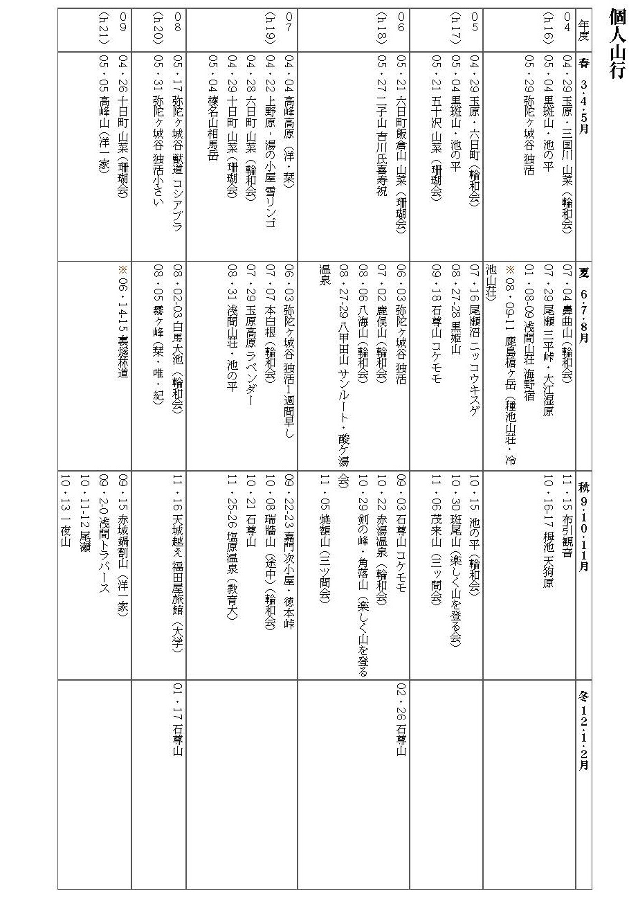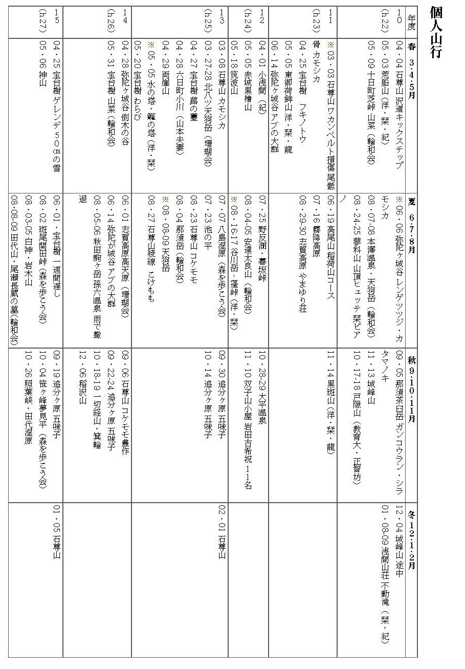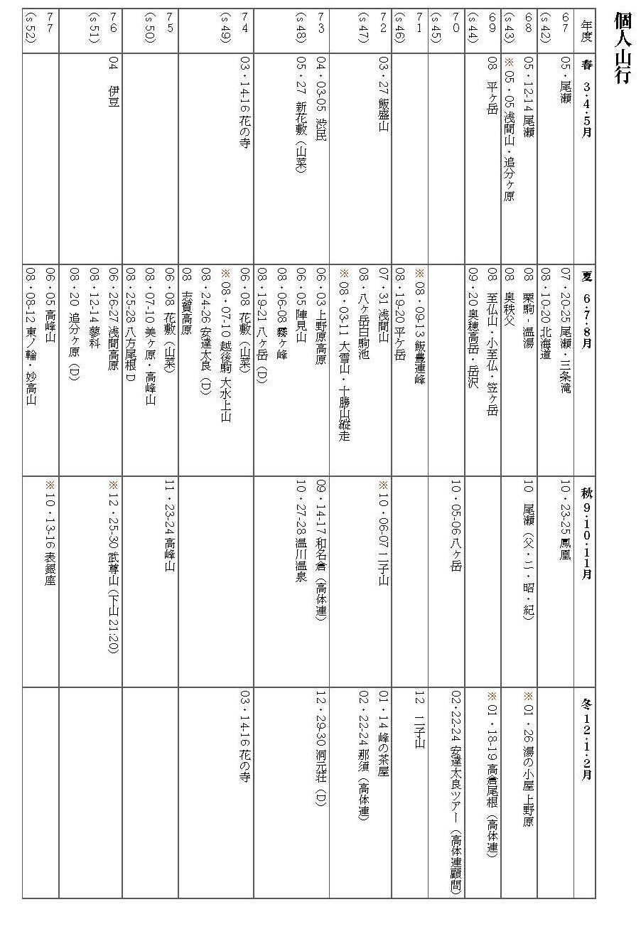 (2)スペースの関係で、「夏山トレーニング山行」「夏山合宿」をひとつの欄、「冬山合宿」「冬山トレーニング山行」をひとつの欄にまとめてあります。トレーニング山行は太字で表記しました。(80年度まで)